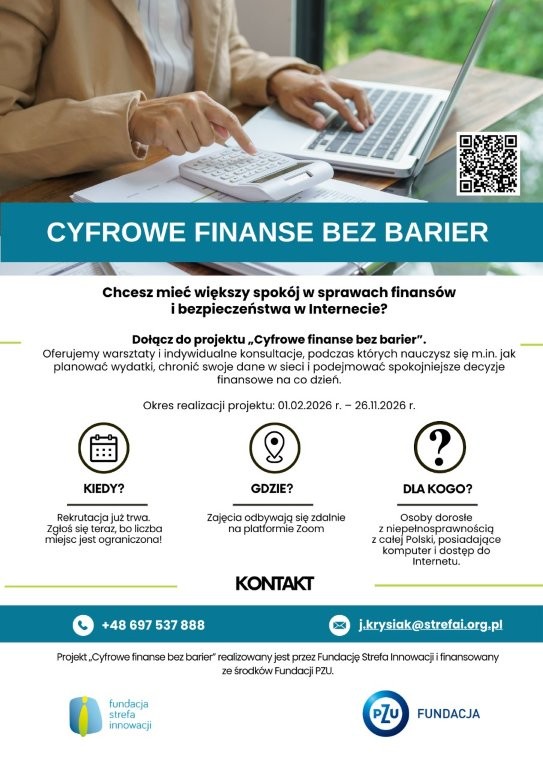 Informujemy, że Fundacja Strefa Innowacji realizuje projekt pn:”Cyfrowe finanse bez barier” skierowany do osób z niepełnosprawnościami powyżej 18 roku życia.
